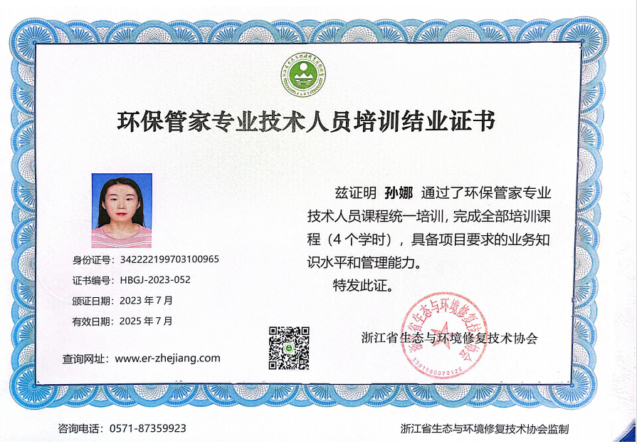 環保管家專業技術人員培訓證書(孫(sūn)娜)